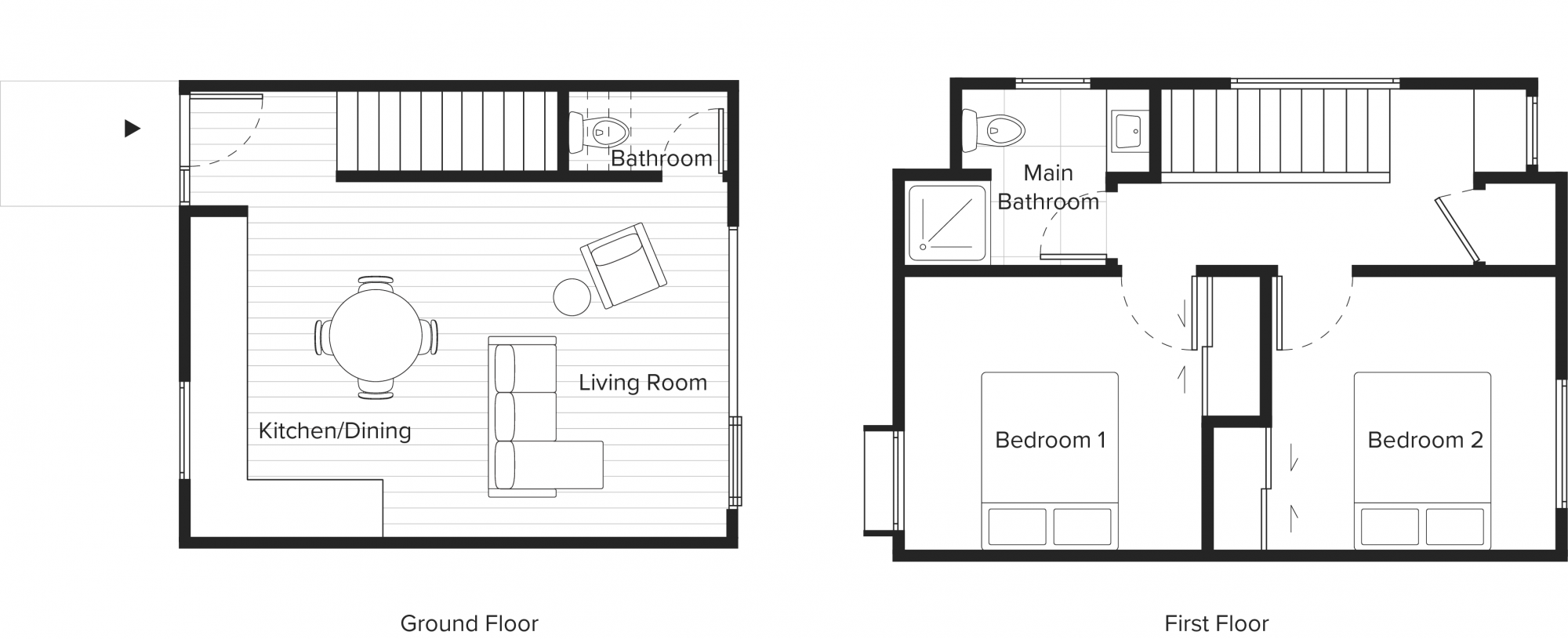 Two bedrooms and one bathroom are positioned on the upper levels, including built-in wardrobes. The ground floor provides well-designed contemporary living, with open-plan spaces that open out onto private courtyard gardens.