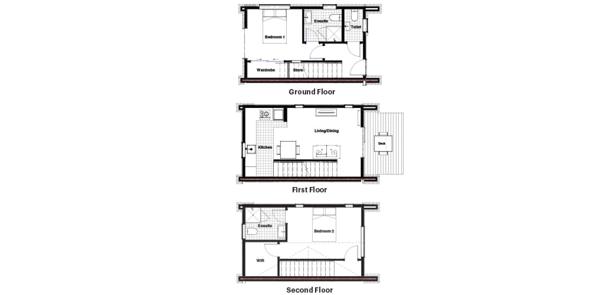 The three storey Townhouses consist of the ground floor being a full-size bedroom which includes a large built-in wardrobe, additional storage space under the stairs and an ensuite; plus separate toilet. Transitioning from the entrance way, the first floor includes the open plan kitchen, dining and living areas, opening on to a balcony.
